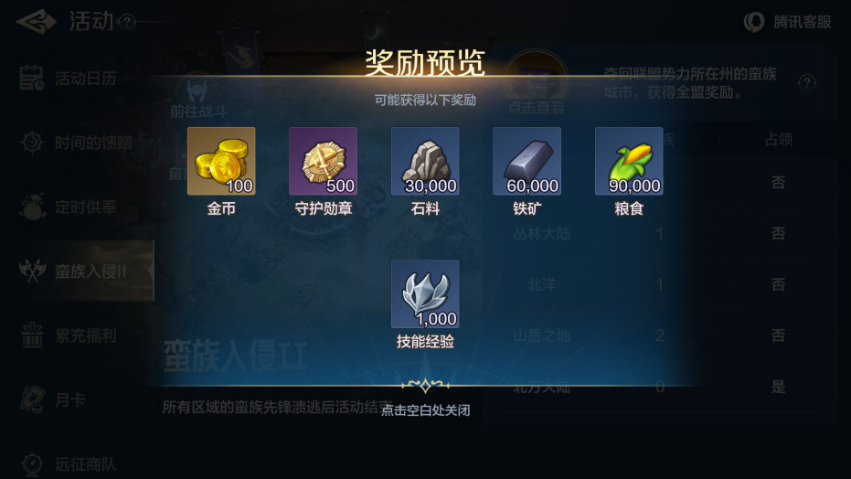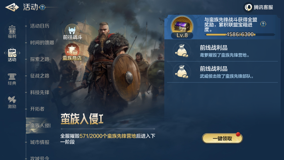 蛮族入侵分为多个阶段。在第一阶段中,击败蛮族部队和摧毁蛮族营地均会获得奖励,奖励不算多,但是有概率全盟发放。也就是说,盟友打了蛮族,你也能拿到奖励。在这其中拿到的守护勋章,则可以在蛮族商店里换取奖励。