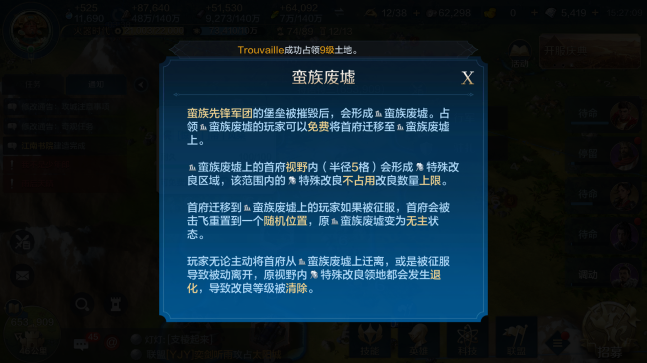 再次,紧跟联盟开拓进度,积极攻打其他地方的蛮族营寨。可以直接借地建造要塞,然后调动部队,也可以再接着迁城。