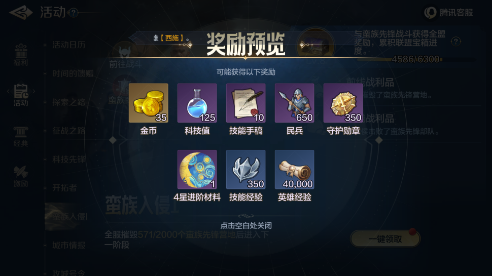 守护勋章能在的蛮族商店中能领到进一步的奖励,靠打蛮族拿的守护勋章兑换。可以兑换基础资源、动员令、科技值、民兵、技能经验、抽卡次数、英雄经验,甚至还能使用英雄助战,奖励还是相当不错的。