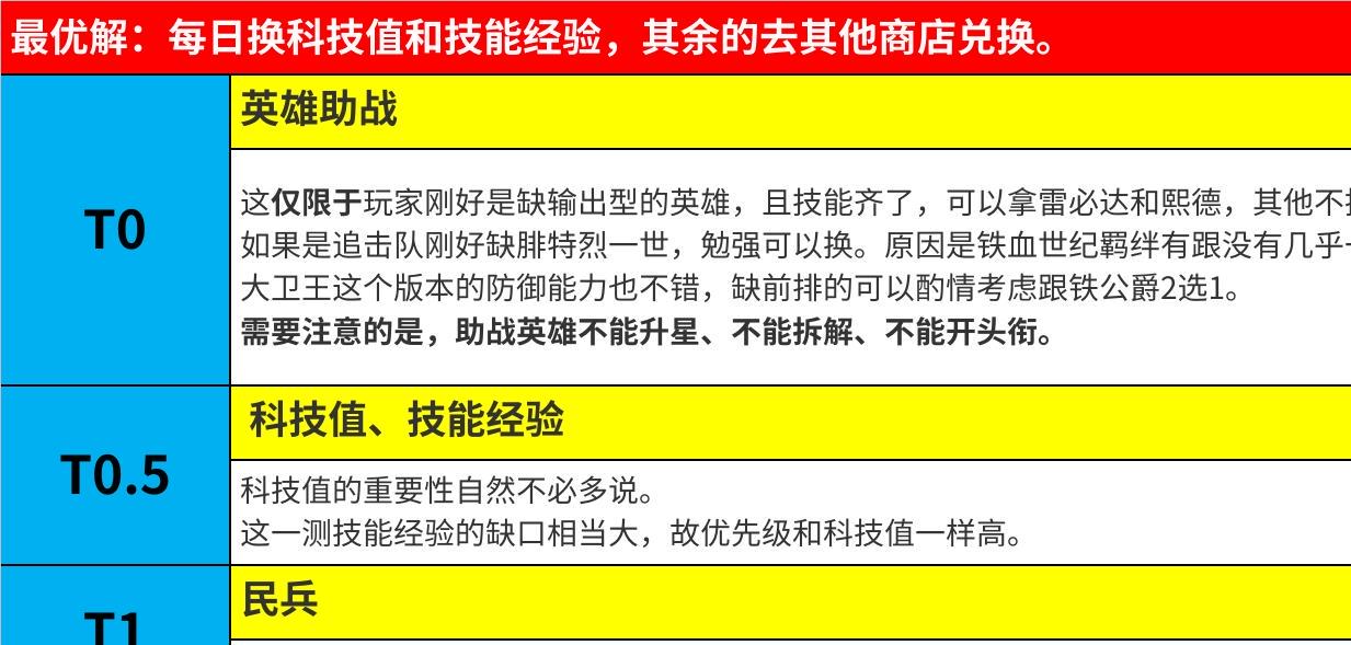 英雄经验、紧急动员令、资源礼包都建议去联盟商店换,甚至于民兵都建议去联盟换,为了省下勋章,每日都能换到科技点和技能经验。