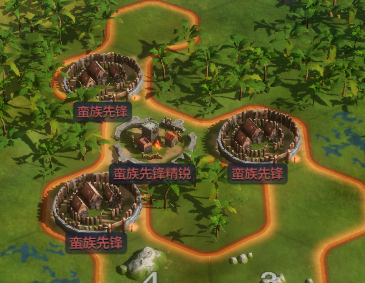 蛮族都集中于地图中心,过了小型关隘就能看见。每个蛮族先锋的营地都会出现一支队伍在营地附近游荡,一旦看见玩家的队伍就会追击。被击败后会退回营地,待其补齐兵力后会重新出现。蛮族部队的重新出现也会消耗营地内的兵力。