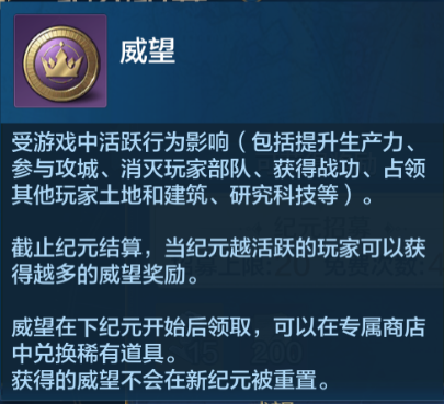 可以理解为本赛季的游戏综合评价,威望越多,评价越高,下赛季能在专属商店中兑换稀有道具,建立大家威望尽量在赛季末期提高,战功是涨威望最快的方法。