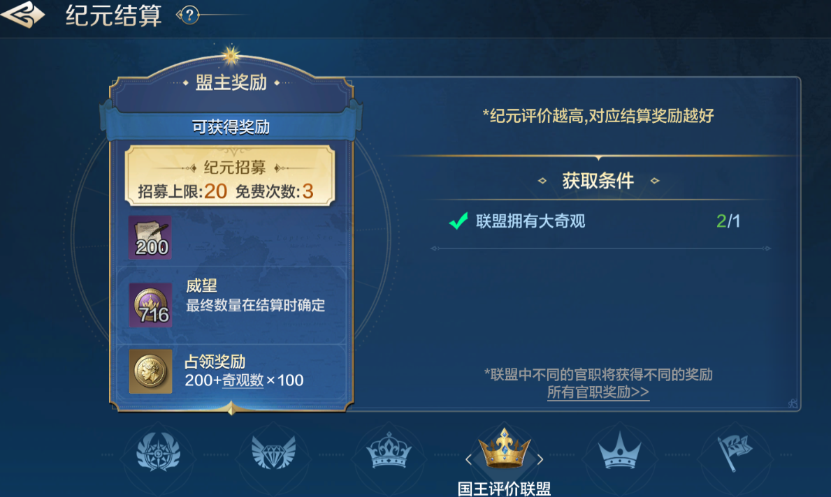 相比较帝王评价联盟,基础金币奖励少了很多,一般是区服第三联盟拿到,不过大多数情况下需要去跟第一联盟或者第二联盟协商,不然很难守住自己的大奇观。