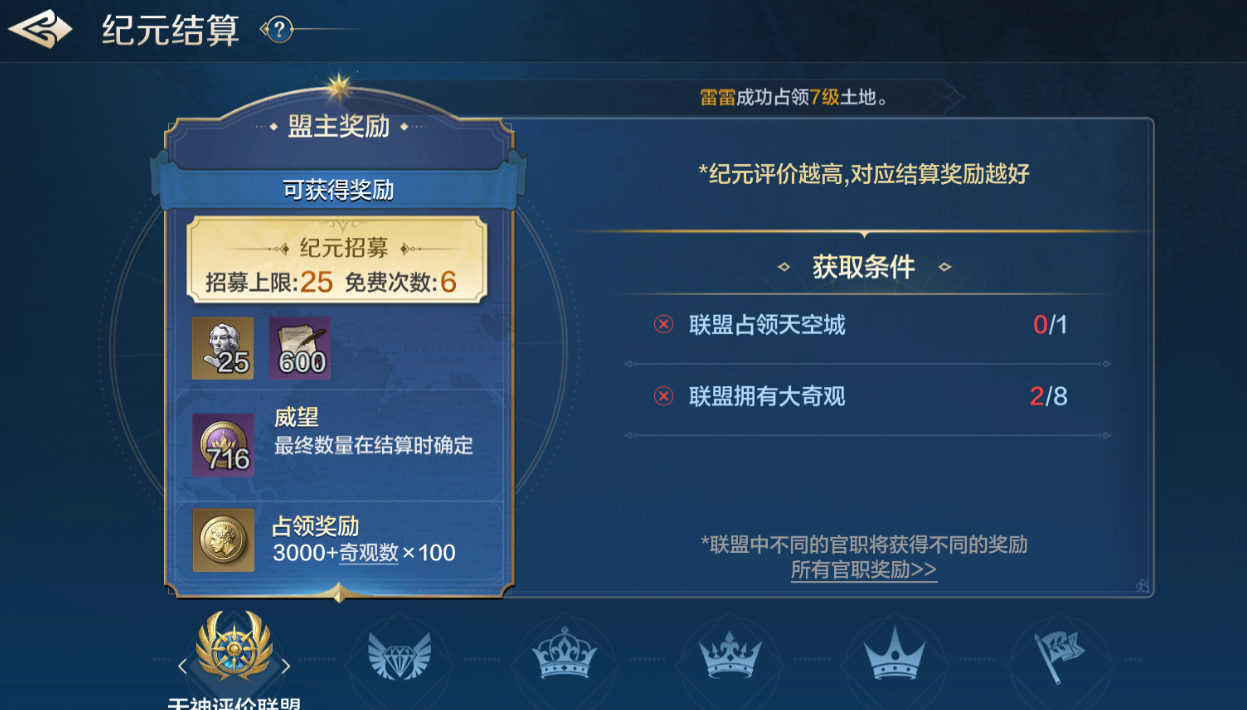 获取条件:联盟拥有1个奇观,很简单,但是这种联盟一般是比较不活跃的,而且如果靠前的联盟有意向拿奇观增加奖励,多半这种联盟也是守不住,建议加入大盟。