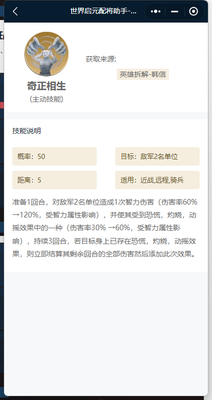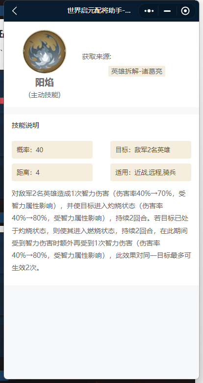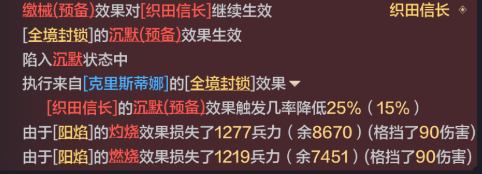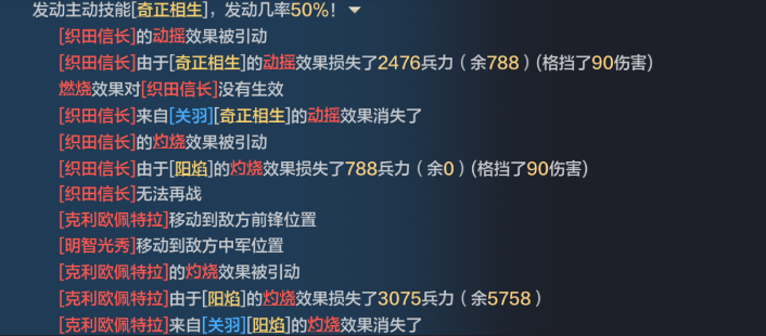 而奇正相生和阳焰配合的关键是奇正相生能够“引爆”灼烧的负面效果,几回合的伤害一次结算。也就是敌方如果有灼烧状态,奇正相生一旦发动直接“引爆”。在不受主动技能发动率提升的情况下,这个“引爆”的概率最高等于奇正相生的发动概率50%。