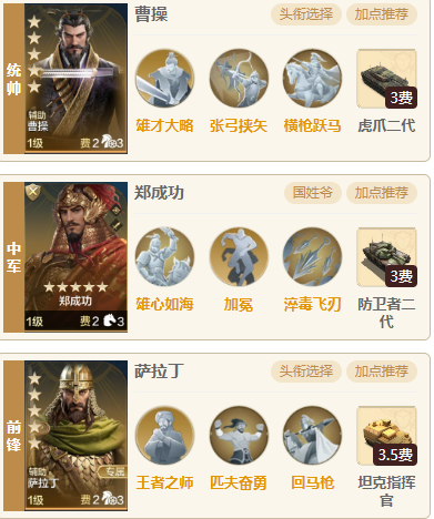 郑成功的攻击敏捷防御比较不错,不过敏捷的数值在骑兵英雄内并不是较高的几个,目前版本都是追击速攻打伤害,即使敏捷不低的情况下还是建议加一手速度或者带上新的先发技能,攻击距离3是硬伤最好放在中军位置加上携带匹夫奋勇即可普攻到敌方统帅身上