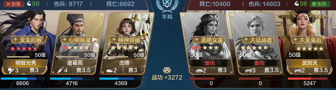 诸葛亮携带决水千仞和张弓挟矢:决水千仞可以给队伍提供增伤,张弓挟矢可以提供先手效果,其实先手效果对于打肉队的加成不高因为怎么样队伍的出手速度都比肉队快,不过面对一些无先发的阵容时可以依靠明智光秀的高额伤害直接先手重伤对面