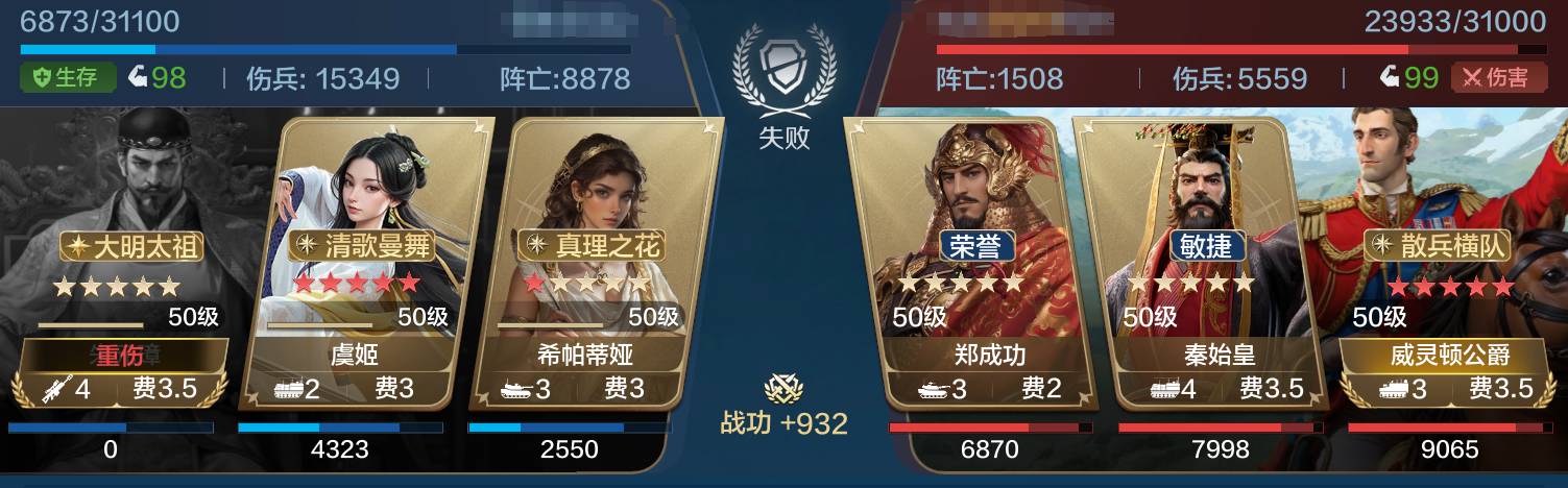 武则天的芝诺队伍打不了,基本不怎么吃控制,这里3.1W兵打2.5W基本打不掉武则天的战损。