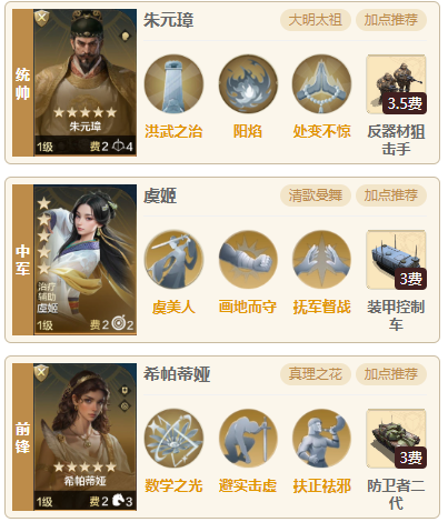 统帅朱元璋、中军虞姬。前锋希帕蒂娅,希帕蒂娅的控制效果很强力,可以控制敌军2名英雄2个回合,还可以提升我军的智力属性,缺点就是发动几率太低,仅仅只有30%。再搭配上虞姬的力竭,一旦希帕蒂娅发动敌军基本动不了,再带上尽可能多的主动技能,让朱元璋来造成足够的伤害击败敌军。