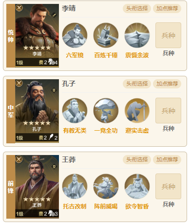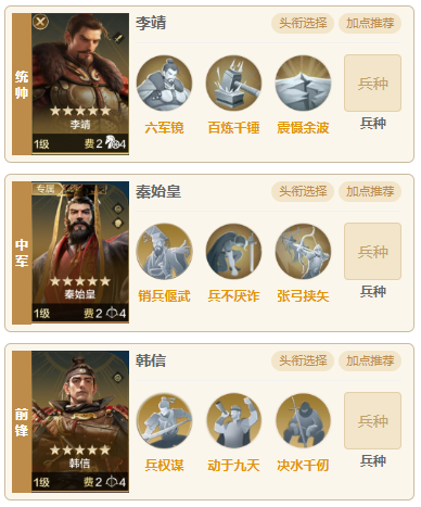 秦皇带张弓挟失+兵不厌诈/制敌机先/全境封锁,根据战况来选择一个限制技能,韩信来增加被控制下的伤害提升,李靖这边依赖百炼千锤提供的韧性,如果震慑余波稳定发挥的情况下,2回合是李靖的最佳爆发期,只要触发自带技能六军镜即可造成大量伤害,缺点是这套阵容后期输出不足,只能打先手爆发。