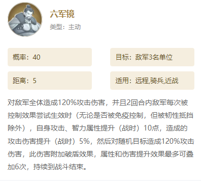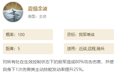 再看李靖的拆技,100%发动概率,对所有处于控制状态的敌军造成80%攻击伤害,再看看亚历山大120%的概率才只能打两个,简直是时代的眼泪。重点是发动震慑余波后会使下次自身伤害类主动技提升25%发动率,因此可以适配大部分主动输出英雄。尤其适合李靖本身