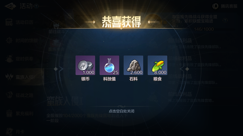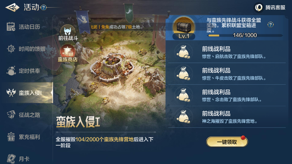 击败蛮族部队和摧毁蛮族营地均会获得奖励,奖励不算多,但是全盟发放。也就是说,盟友打了蛮族,你也能拿到奖励。在这其中拿到的守护勋章,则可以在蛮族商店(科技树里目前写的是战术布置)里换取奖励。