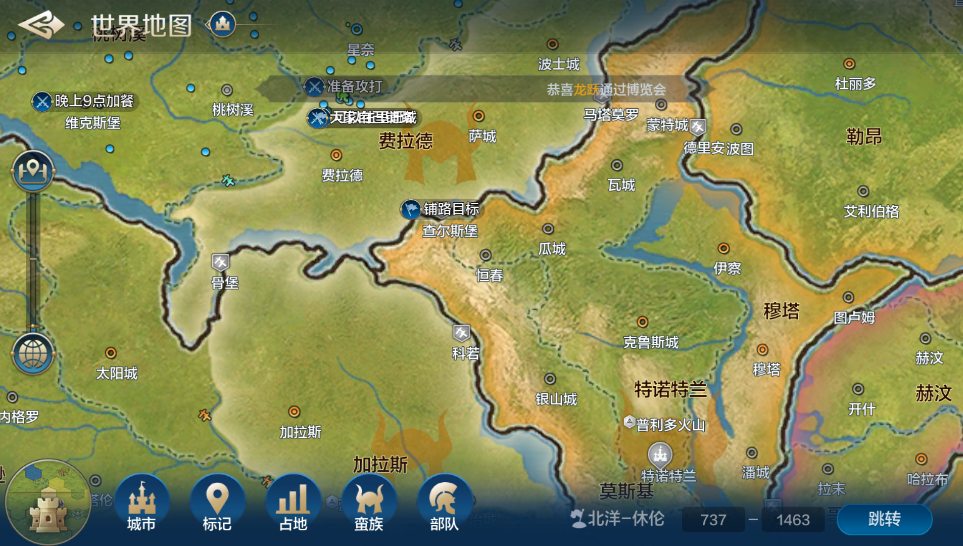 蛮族基本上都是集中在地图的中心区域,过了小型关隘就能看见。在大地图上也有显示。在地图中心的城市基本都被蛮族占领,但是攻略难度没有变化。