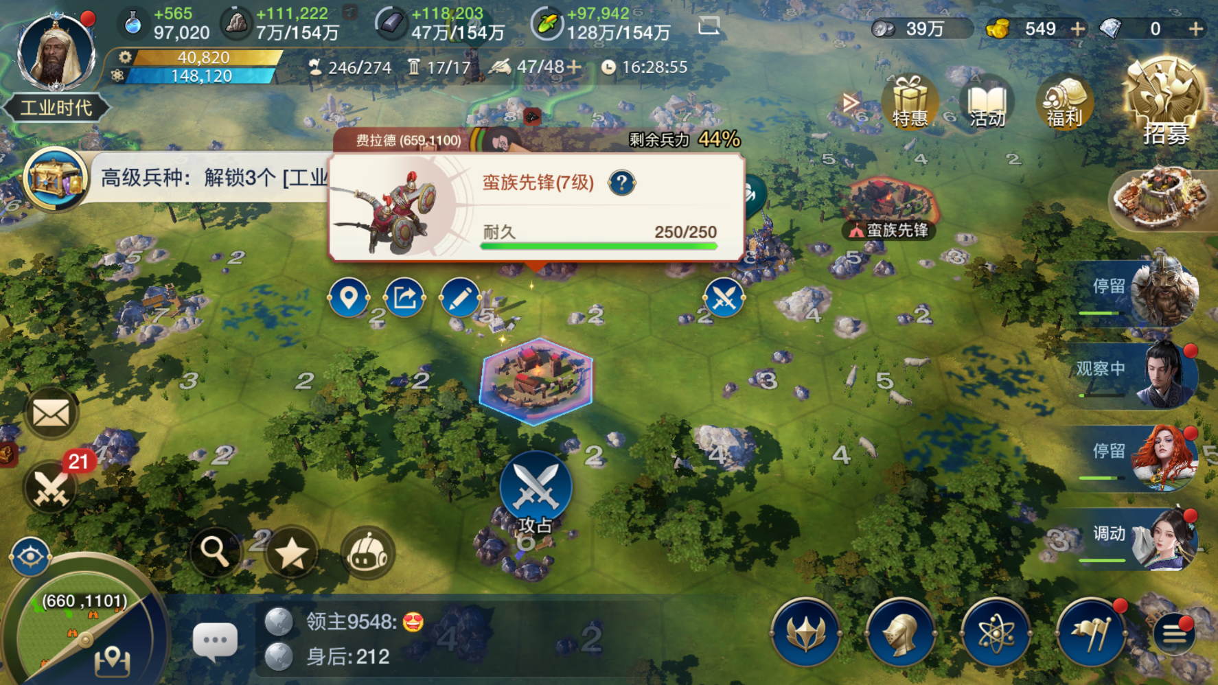 刚好,9级以上的高级地也多出现在地图的中心区域,而9级和10级以上的资源地也是达成关键科技的加速条件的要点。在后期一项科技所需要的科技点非常多,如果不达成加速条件用科技点硬莽,可能进度会卡好久。所以越早参加蛮族入侵越好,这样就不至于在后期被卡脖子。