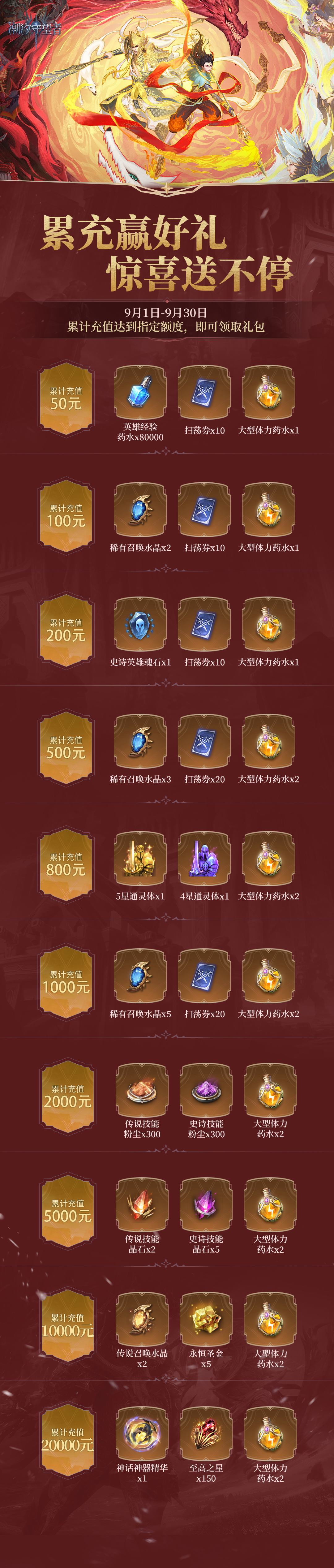 【活动内容】:活动期间内,累计充值达到指定额度,即可领取对应档位的超值奖励!