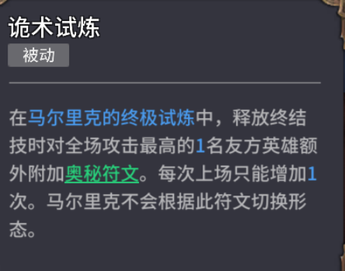 天赋(友方增益):每次上阵时生效,可赋予攻击范围内攻击数值最高的友方奥秘符文(提升15%攻击、防御、生命数值)。此增益为马尔里克独有,可与其他增益效果叠加。