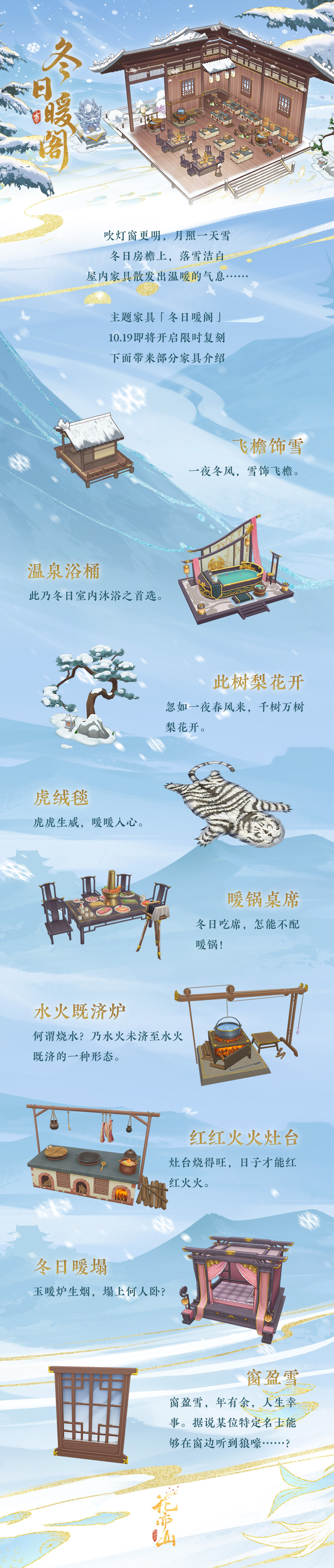 *10月19日5:00-11月4日4:59,【祈巧阁】中将开启【冬日暖阁】主题家具的限时复刻,具体获取规则可前往游戏内查看