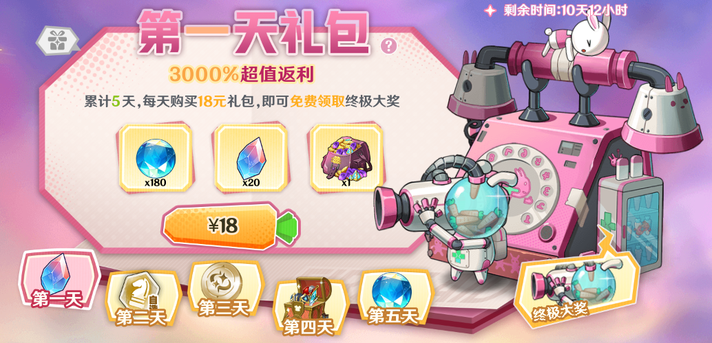 每天的礼包性价比都大于等于3000%,很适合小氪及以上的玩家购买。最终的核心【摇人急救兔】对于后续的主线推关也很有帮助。