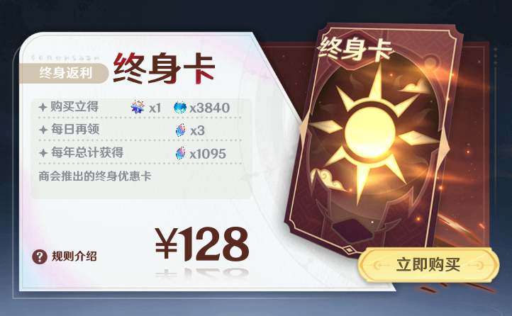 128元终身卡,购买立即获得1个超级十连道具和3840钻石,这些道具价值加一起基本就超过128了,每天还可获得3个许愿石(永久),性价比超高。