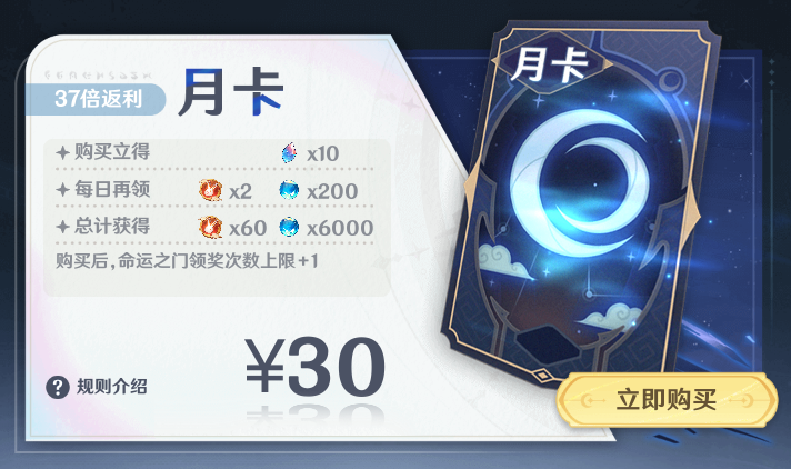 30元月卡,购买即得10个许愿石,每天2个兔王币和200钻石,兔王币可在兔王商店兑换一些稀有道具。除此之外,还有一些特权,而且不少主题活动如果有月卡的话,还可以额外领取奖励,强力推荐。