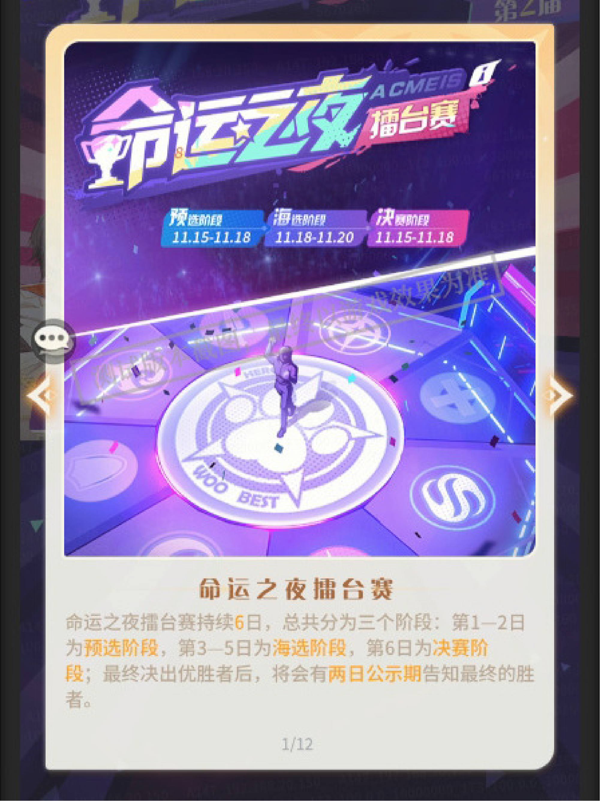 ● 1月12日~1月21日,开服≥19天的服务器将开启命运之夜擂台赛,其中12日开启赛事预告。