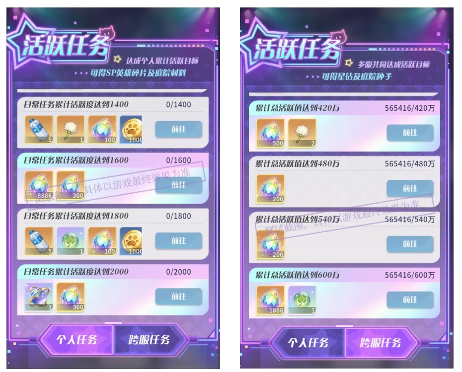 - 个人活跃任务:在活动期间,达成个人累计活跃目标,可获得大量星钻、超魔宝石、庭院种子及加速道具等珍稀奖励。