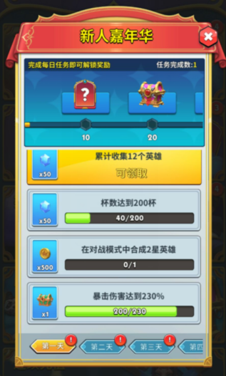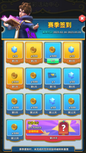 游戏中的活动中心有许多丰厚的福利活动,这里主要推荐新人嘉年华、开服大赏、赛季签到,新手玩家可以通过这三个活动获得金币、钻石,除此之外还能在这里获得随机英雄卡开出传说英雄,零氪金的小伙伴一定要记得参与哦