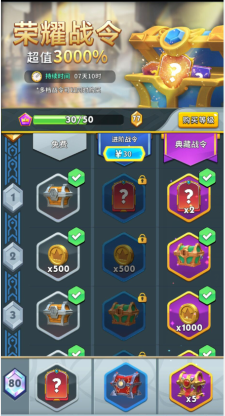 所有登录游戏的召唤师都可以解锁免费的荣耀战令,通过对战模式、每日任务,赛季任务等途径来提升战令等级,领取金币、钻石、宝箱、传说卡等丰厚的战利品,召唤师们也可以随时将免费的荣耀战令进阶为进阶战令和典藏战令,获得更多超值奖励。