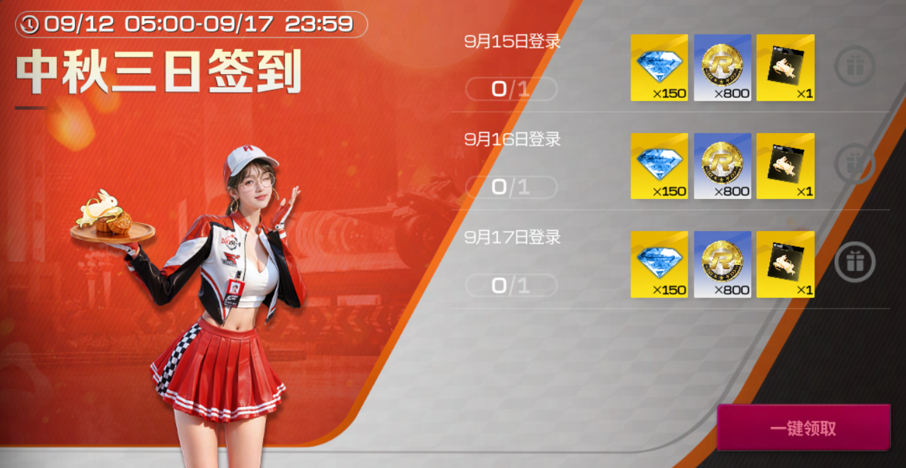 在这里还要提前祝愿各位车手们中秋节快乐,不要忘记在周末上线领取免费的周末连抽福利以及中秋签到福利哦~