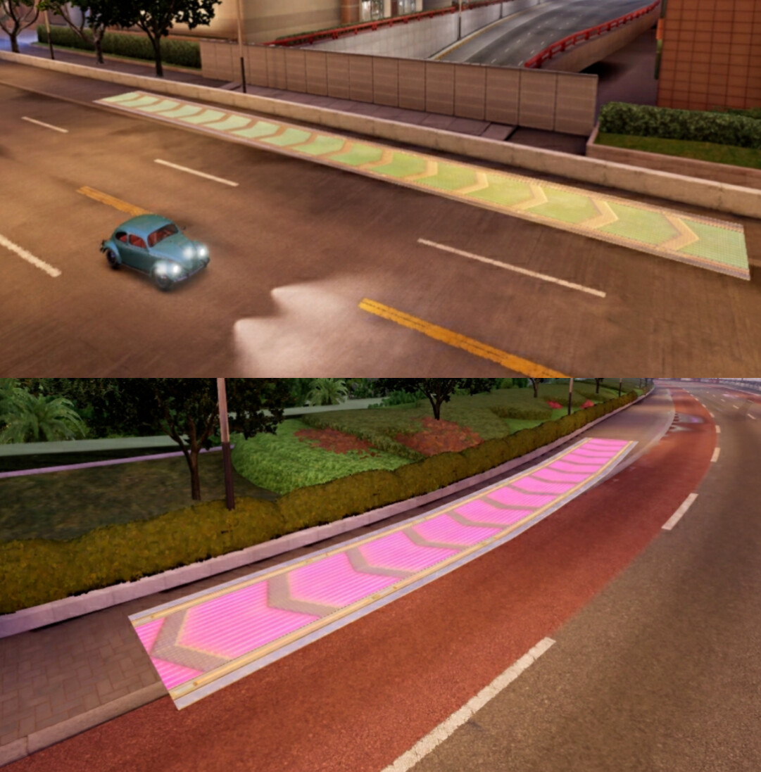 彩虹加速/减速带:像洒落一地的水果糖,碾过去瞬间——咻!加速带你直冲云霄,减速带则像踩进黏糊糊的太妃糖中,刺激!