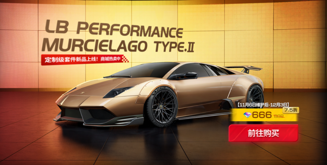 同时兰博基尼 Murcielago LP670-4 SV '10 全新定制级套件“LB PERFORMANCE MURCIELAGO Type.Ⅱ”将于11月6日维护后至12月4日 04:59限时折扣直售!活动期间享受专属优惠,结束后将恢复原价,心动的车手务必把握机会!