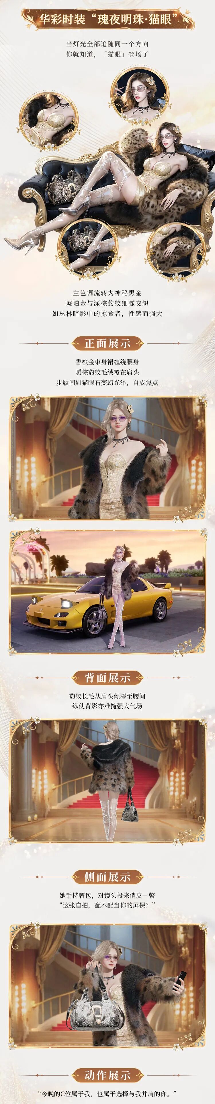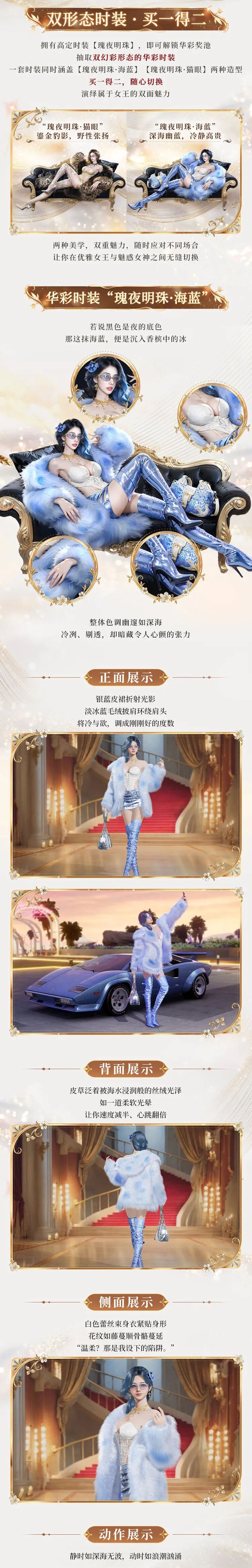 获得高定级时装“瑰夜明珠”后,即可抽取双幻彩形态的华彩时装“瑰夜明珠·海蓝”(另一形态为“瑰夜明珠·猫眼”)!一次获取,两种造型自由切换,以双重美学演绎极速世界的时尚魅力。