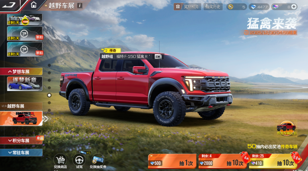 车手可选择使用钻石直接抽取或通过合约币兑换越野车展连抽次数,50抽内必得福特 F-150 猛禽 R '24,见证红色“R”标在您车库中点燃!此外,越野车展兑换商店亦同步开放,助力车手精准锁定心仪座驾。