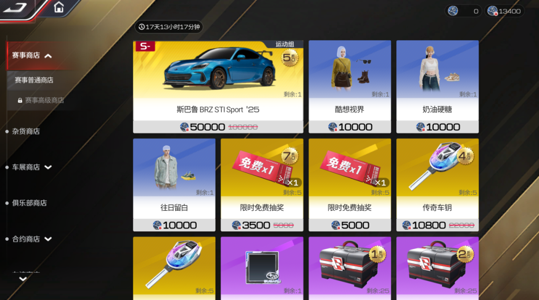 解锁高级合约后,达成指定等级还能再直领一台斯巴鲁BRZ STI Sport '25,轻松升阶不在话下!同时还能解锁高级商店权限,可使用竞猜币或宝石为爱车补阶!更有10W竞猜保护额度开启“福利暴走模式”,超多竞猜币等你收入囊中!