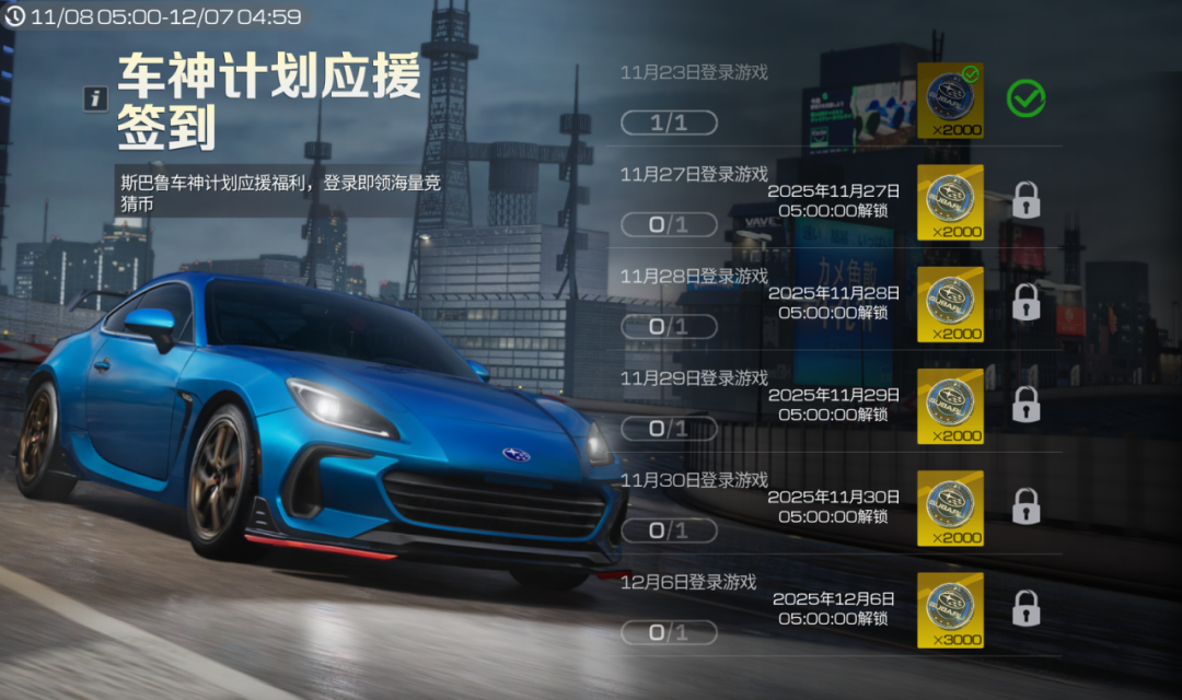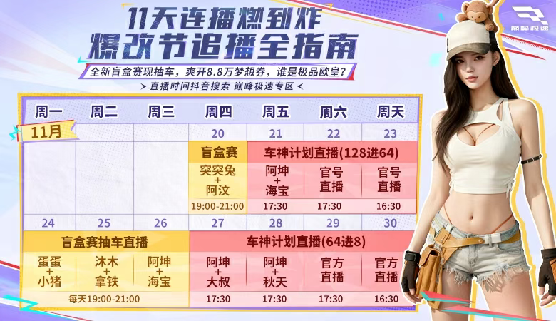 【车神计划】64强进8强的生死对决,将于11月27日(本周四)开启!同时在比赛日期间登录游戏即可每日免费领取2000竞猜币,可以为你的心仪选手下注助威,毫无压力!
