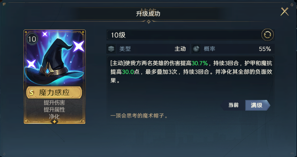 主动技能,55%概率释放,使我方两名英雄伤害获得百分比提高,持续3回合;护甲和魔抗提高30点,最多可叠加3次,持续3回合。并净化其全部的负面效果。