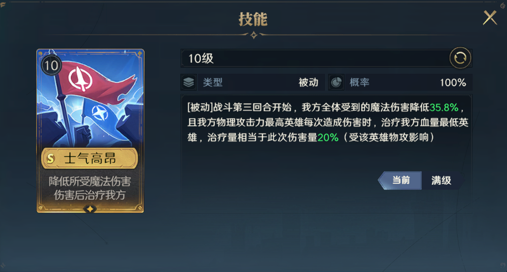 被动技能,战斗第三回合开始 ,我方全体获得魔法免伤,且我方物理攻击力最高的英雄每次造成伤害时,治疗我方血量最低英雄,治疗量为此次伤害量的20%,受该英雄物攻影响。