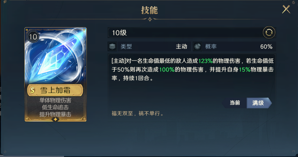 主动技能,60%概率释放,对1名生命值最低的敌人造成高额物理伤害,若其生命值低于50%,则再次造成高额物理伤害,并提升自身15%暴击率,持续1回合。