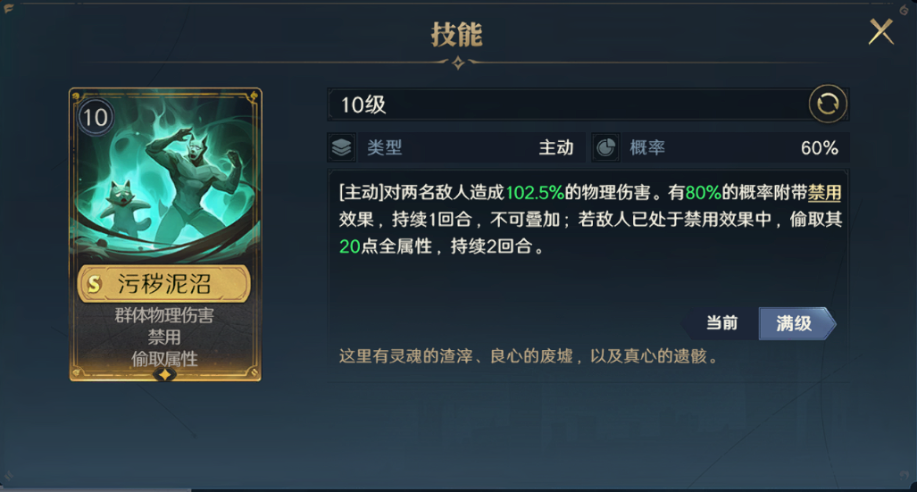 该技能为物理队辅助技能,功能十分强大,群体物理攻击可以补充伤害,【禁用】效果负责提供控制、与其他技能联动形成控制链并提供负面环境,同时还可以偷取敌方全属性,削弱敌人的同时增强自身。