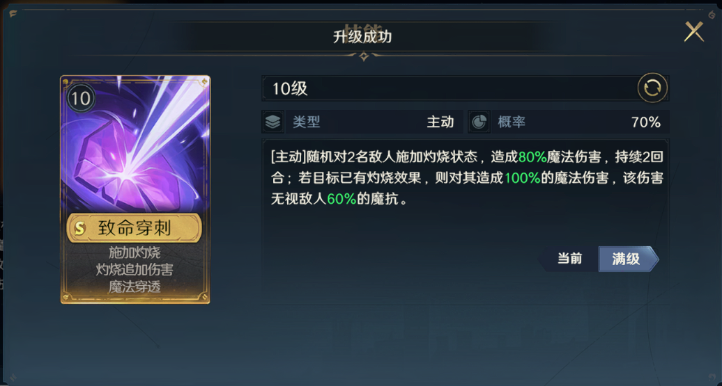 主动技能,70%概率释放,对随机2名敌人施加【灼烧】状态,造成魔法伤害,持续2回合;若目标已有灼烧效果,则对其造成额外的魔法伤害,该伤害无视敌人60%魔抗。