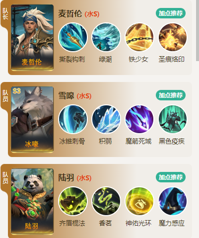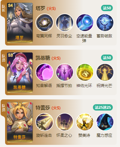 该阵容以宙斯为输出核心,通过技能联动,获得控制、增伤与爆发能力,塔罗偷取属性叠加优势,被动提供治疗与减伤,最强辅助特蕾莎为全队提供减魔抗、增伤、减伤、技能释放概率等增益,形成属性压制-群控群伤-破防治疗的循环体系,同时兼顾爆发与稳定性,开荒强度一流。