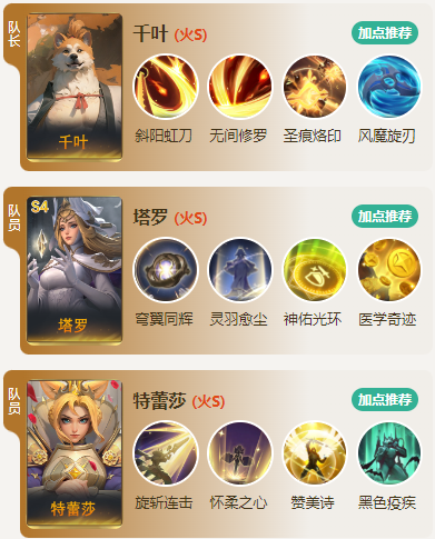 该阵容以千叶为核心,通过技能联动,自身即可形成输出-防御的小循环;塔罗偷取属性为队伍奠定数值优势,同时提供治疗、增伤等效果;特蕾莎破魔、增伤减伤兼顾,携带控制技能用以压制地方输出。整个队伍兼顾属性偷取、破防输出、多层治疗与护盾防护,在中长线战斗中存在显著优势。