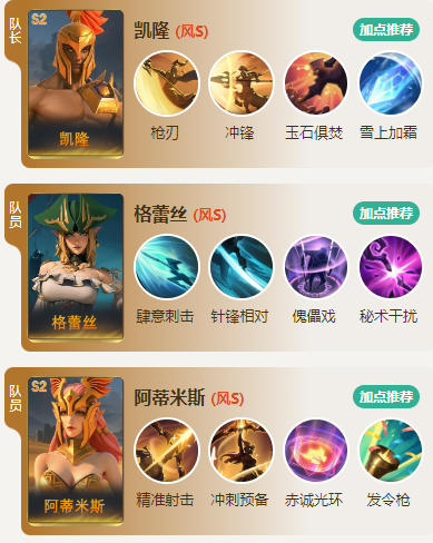 该阵容以凯隆的破甲输出为核心,配合【玉石俱焚】进一步降低敌方双抗,格蕾丝锁定残血进行收割,阿蒂米斯为全队提供增速效果,携带【发令枪】保证技能发动概率,形成破甲-提速-锁头的连贯节奏,利用先手优势可快速瓦解敌方阵线,适合速战速决的PVP场景。