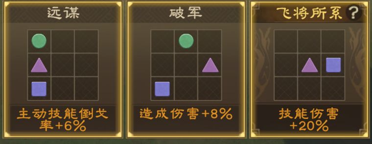 触发效果上,最优配置如下,分别为:远谋,破军,飞将所系。