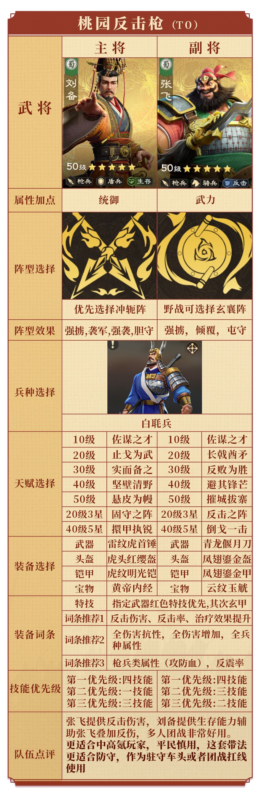 目前最强的反击队伍,1VN很强,但比较惧怕对面弓兵普攻队。张飞为限定武将,没有时前期可以使用关羽。