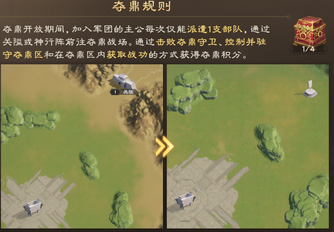 ● 夺鼎战场中己方军团控制夺鼎区域后,区域内的部队每分钟可获得夺鼎积分;