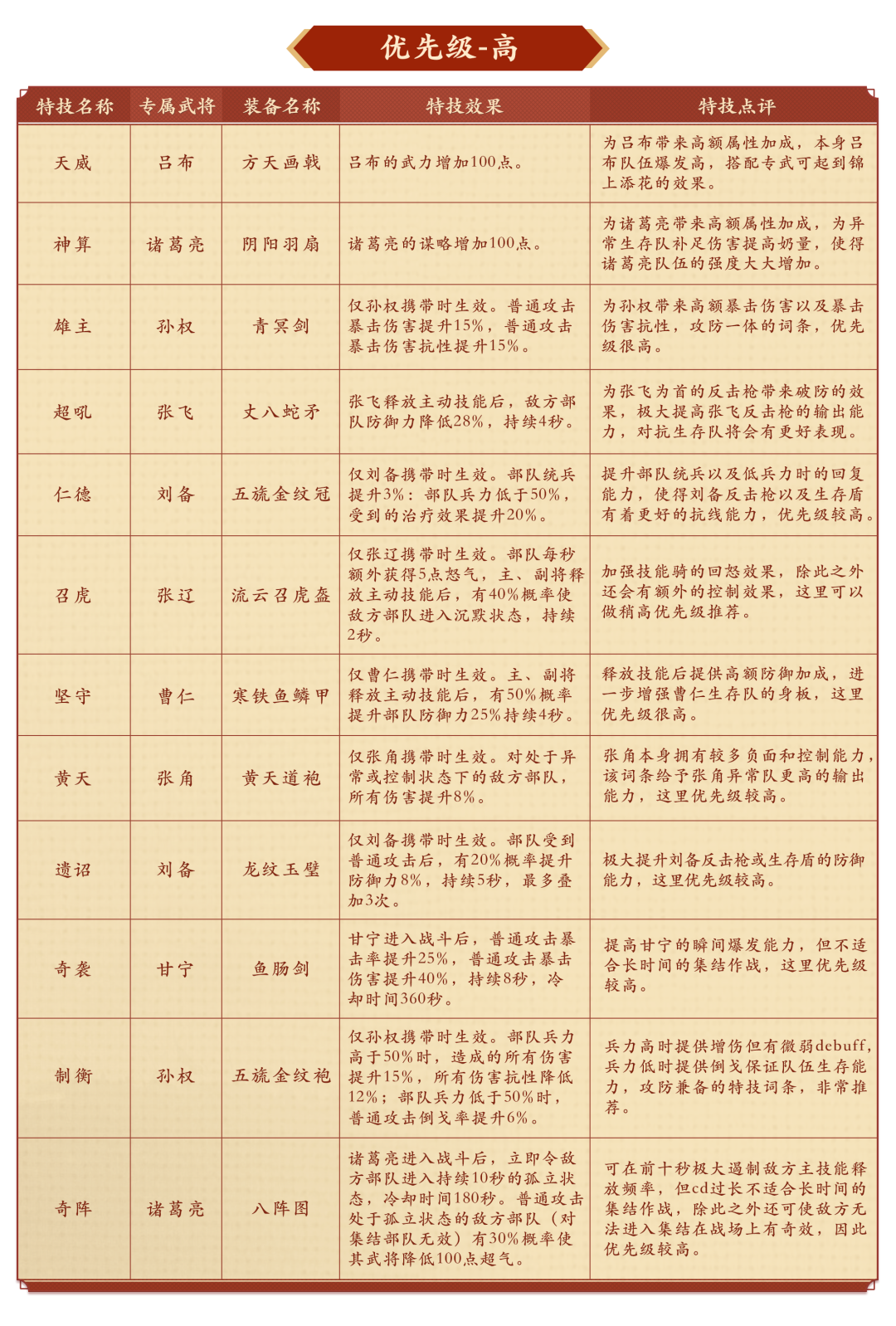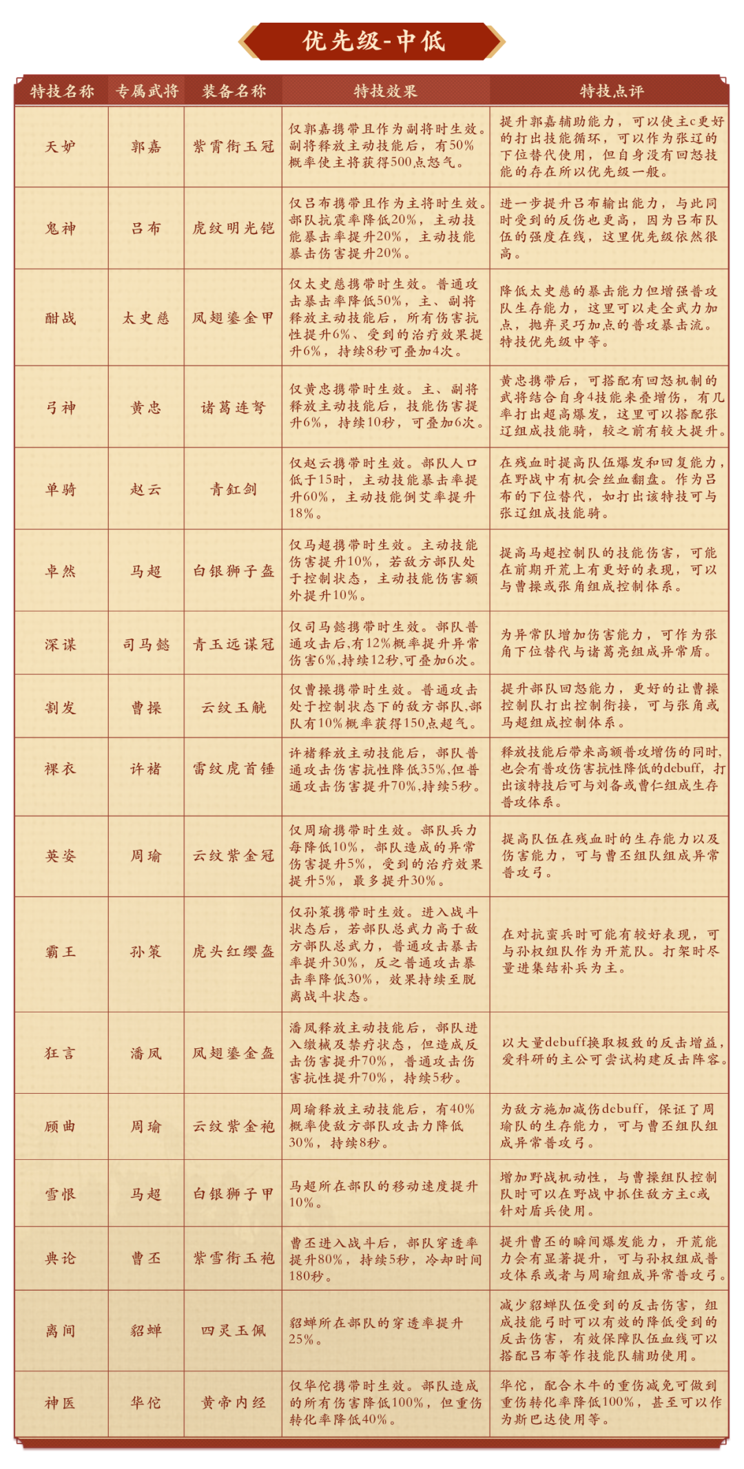 鉴于当前武将特技较难打出,若未能打造出上述高优先级装备特技,主公们也可以围绕已打出的其他专属特技,尝试构建专属核心队伍。
