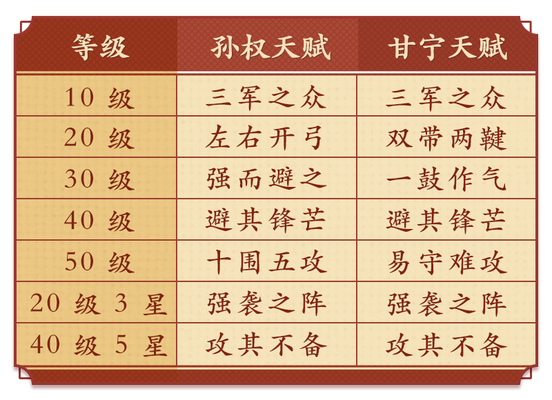 ● 兵种:两人均选择武射吏,10级解锁“三军之众”天赋,20级分别搭配“左右开弓”(孙权)、“双带两鞬”(甘宁),30级再解锁“一鼓作气”(孙权)、“强而避之”(甘宁),全面强化普攻输出与生存能力。