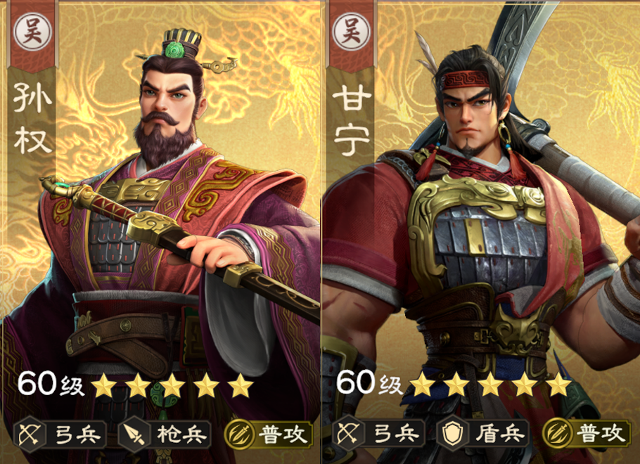 ● 副将:甘宁(60级 弓兵/盾兵),定位爆发输出,属性加点可选灵巧或武力,根据装备词条灵活调整,强化队伍整体普攻爆发力度。