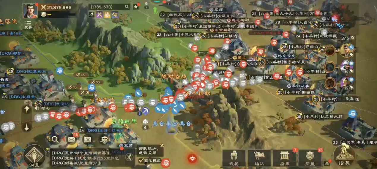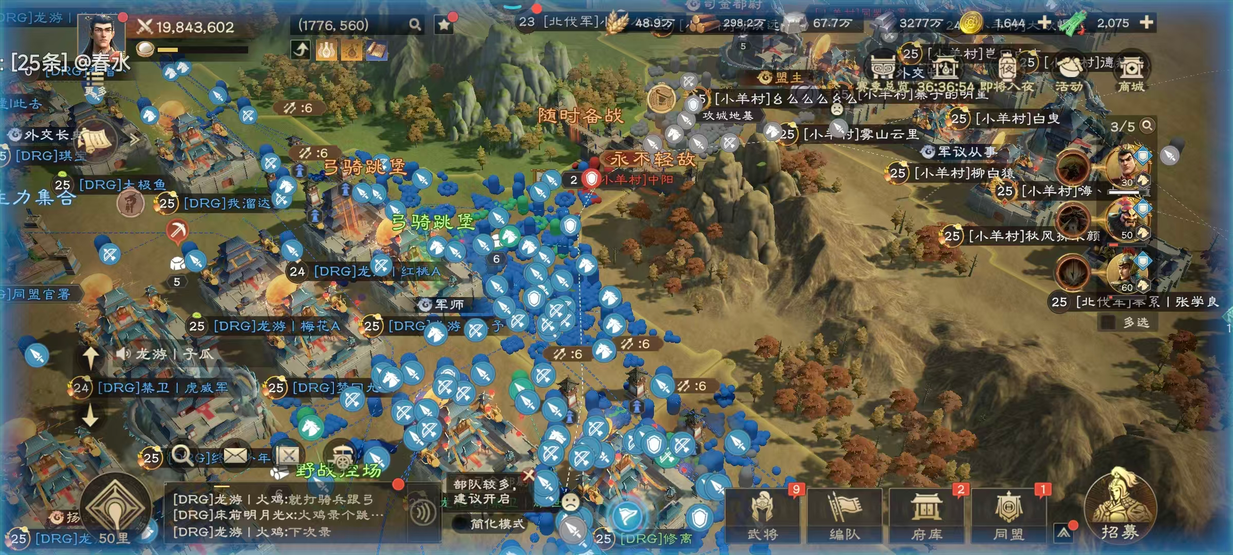 这个是当时与54小羊村在关口对垒,双方同时上百队互相侦查的画面,导致不少手机在玩游戏的玩家叫苦连天,简称为:信息战!